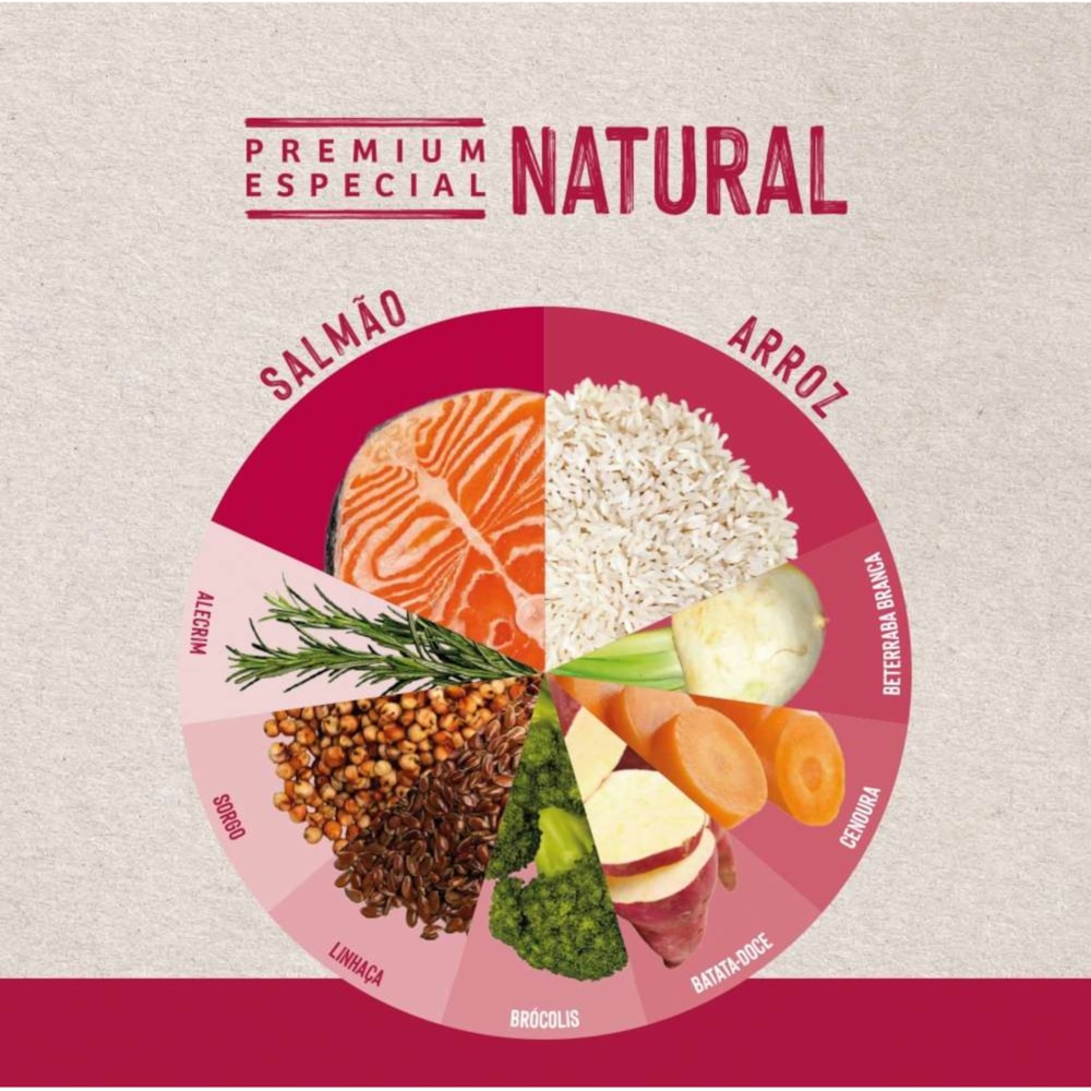 Milho integral moído, salmão desidratado, farelo de soja, arroz integral, polpa de beterraba, gordura de frango, levedura seca de cervejaria, cloreto de potássio, carbonato de cálcio, fosfato bicálcio, cloreto de sódio, DL-metionina, betaína, extrato de yucca, vitaminas e minerais.
