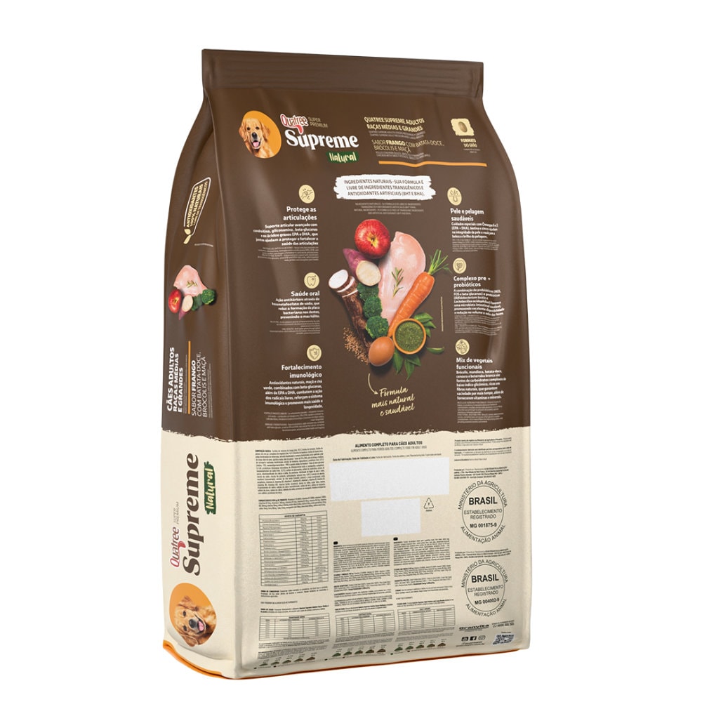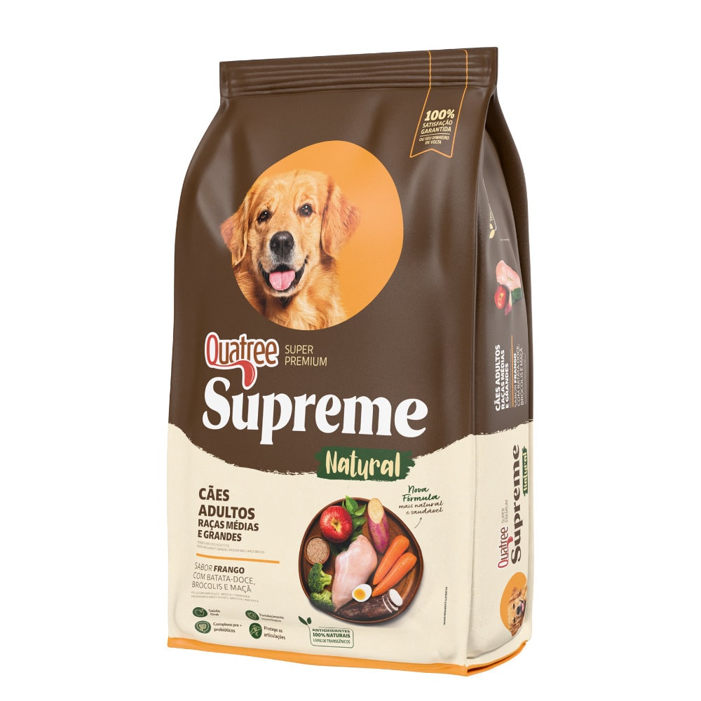 A Quatree Supreme para cães adultos de raças médias e grandes oferece uma alimentação super premium completa, com ingredientes naturais, prebióticos, probióticos, ômegas, suporte articular e ação antitártaro. É uma excelente escolha para quem busca nutrição de alta qualidade, cuidado diário e mais bem-estar para o pet.
