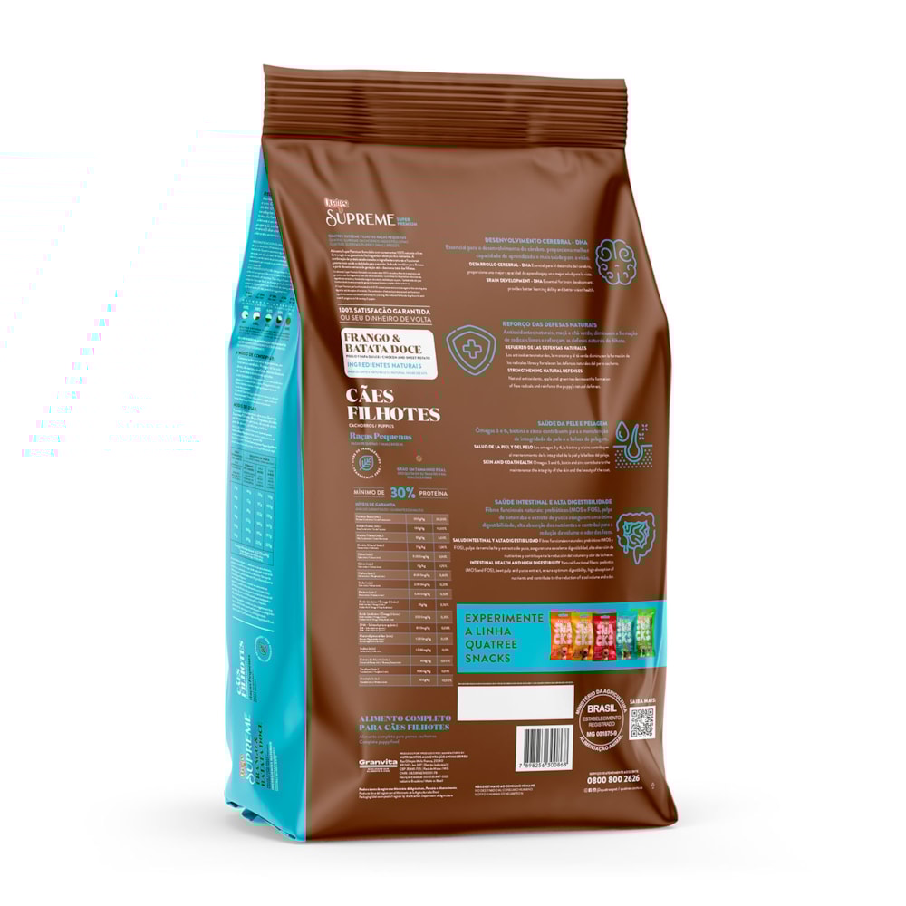 Promova um Crescimento Saudável desde o Primeiro Dia: Com a Ração Quatree Supreme de Frango e Batata Doce para Filhotes de Raças Pequenas, você está dando ao seu filhote uma base sólida para uma vida inteira de saúde e felicidade. Invista no futuro do seu filhote com esta ração de qualidade superior.