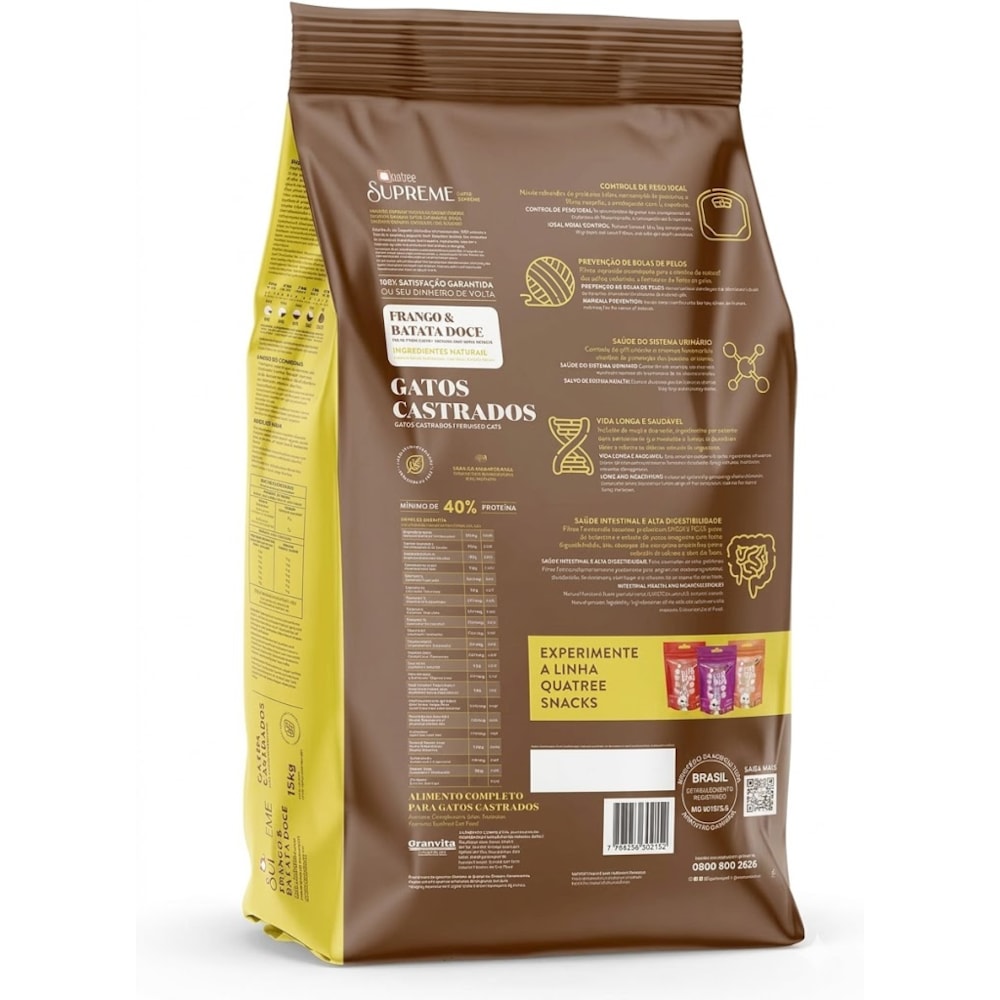 A Quatree Supreme sabor Frango é um alimento Super Premium de alta performance, desenvolvido para oferecer uma nutrição completa e equilibrada para gatos castrados de todas as idades. Com foco em uma dieta rica em proteínas e ingredientes nobres, ela garante que seu pet mantenha a vitalidade enquanto cuida das necessidades específicas do metabolismo pós-castração.
