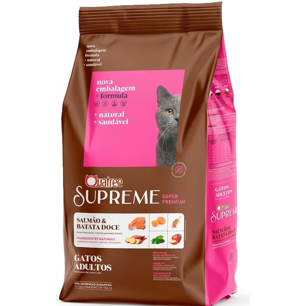 A Quatree Supreme Gatos Adultos é uma escolha de excelência para quem busca uma nutrição equilibrada e de alta performance. Formulada com ingredientes nobres, esta ração combina o sabor irresistível do salmão com os benefícios funcionais da batata-doce, garantindo que seu gato receba todos os nutrientes necessários para uma vida ativa e saudável.