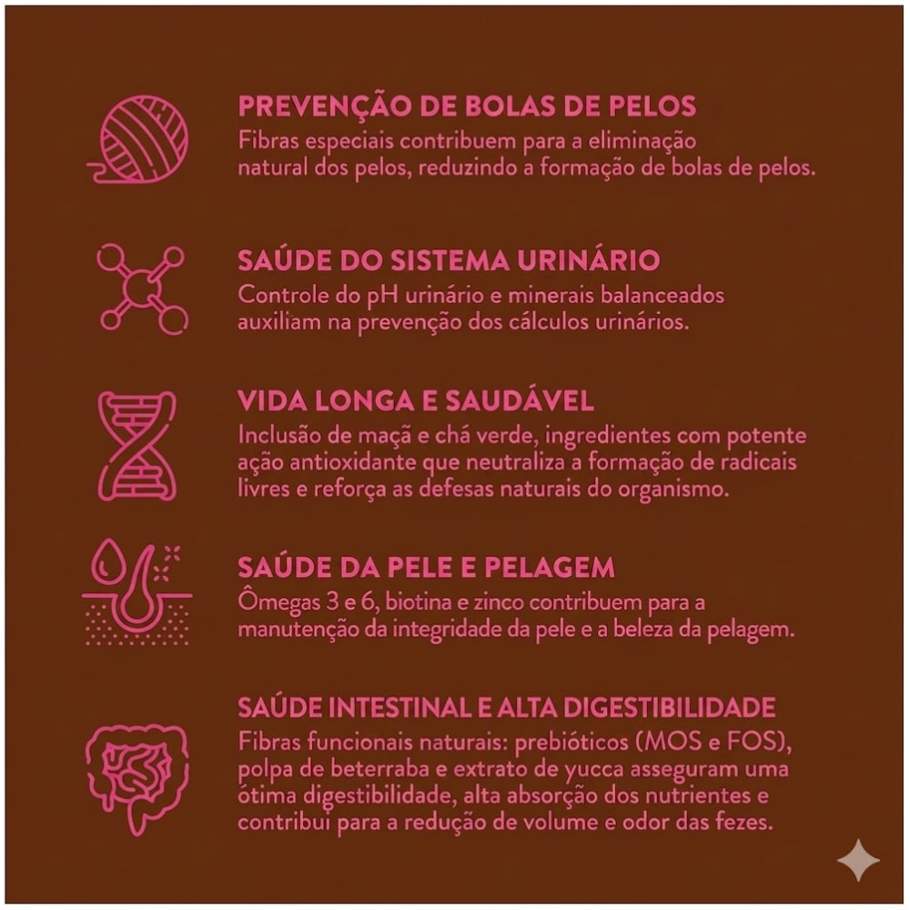 Bem-estar Geral: Auxilia no fortalecimento das defesas naturais do organismo, mantendo o gato disposto e saudável no dia a dia.