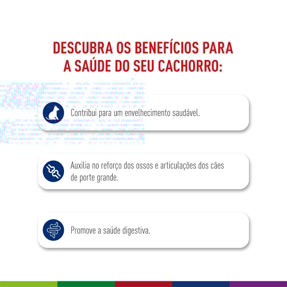 Apoio a ossos e articulações: Formulada para ajudar a manter a saúde dos ossos e articulações, que podem ser sobrecarregados pelo peso corporal dos cães de grande porte.