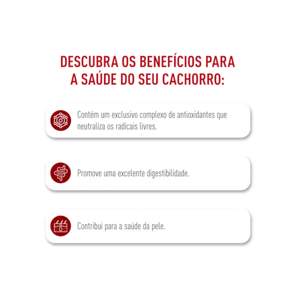 Saúde da pele e pelagem: Enriquecida com ácidos graxos ômega 3 (EPA e DHA), que auxiliam na manutenção de uma pele saudável e pelagem brilhante.