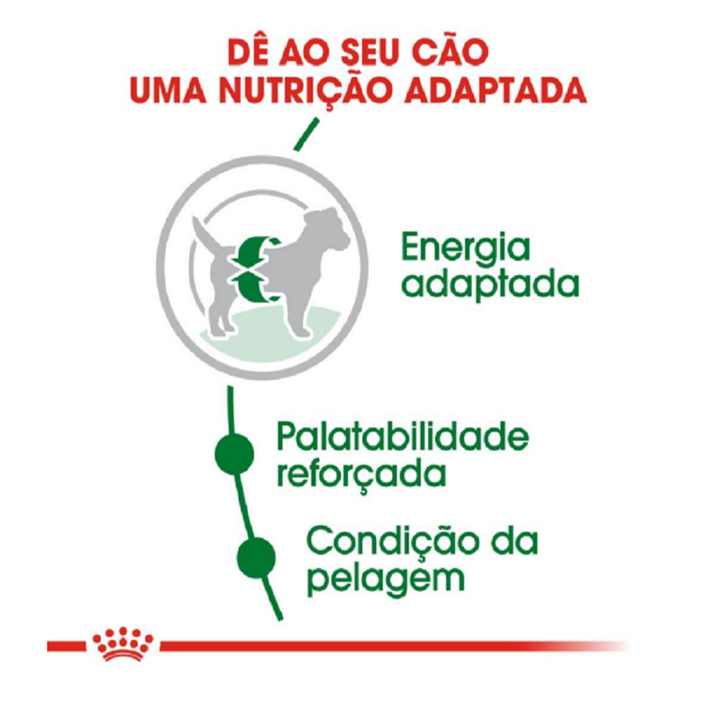 A Ração Royal Canin Mini Adult para Cães Adultos de Mini Porte oferece auxílio aos cães de pequeno porte para manter o peso ideal, e com isso satisfazendo as suas elevadas necessidades energéticas. Através da sua combinação única de aromas, satisfaz os apetites mais delicados e exigentes. A Ração Royal Canin Mini Adult para Cães Adultos de Mini Porte contém nutrientes que auxiliam na manutenção da saúde da pele e da pelagem. Também auxilia na redução e na formação de tártaro graças a agentes quelantes de cálcio.