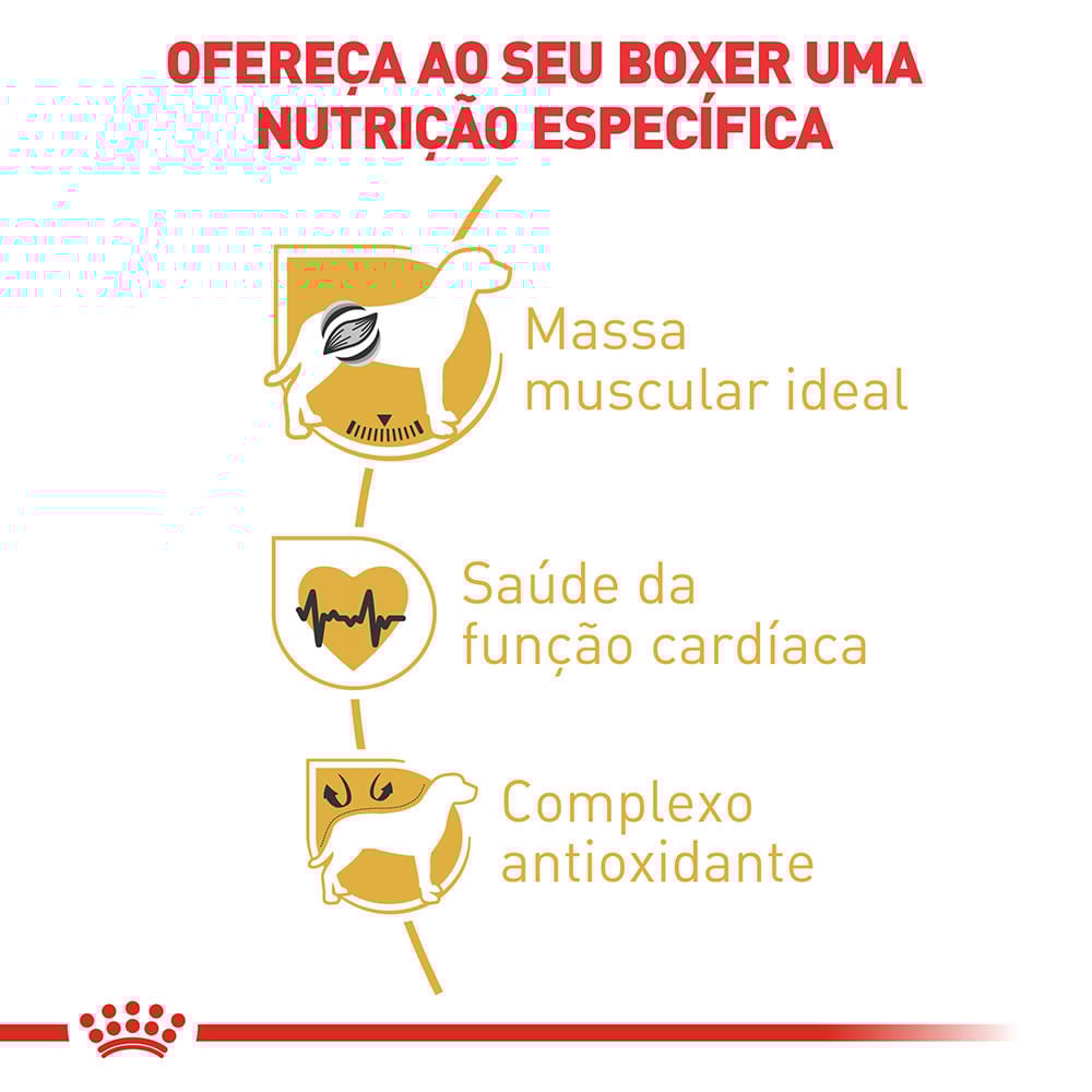 O Boxer é uma raça que possui característica de grande vivacidade e submete seus músculos e articulações a grande esforço. Um alimento sob medida que contribui para manter um bom desenvolvimento da massa muscular e prevenir a sensibilidade articular e as inflamações associadas.