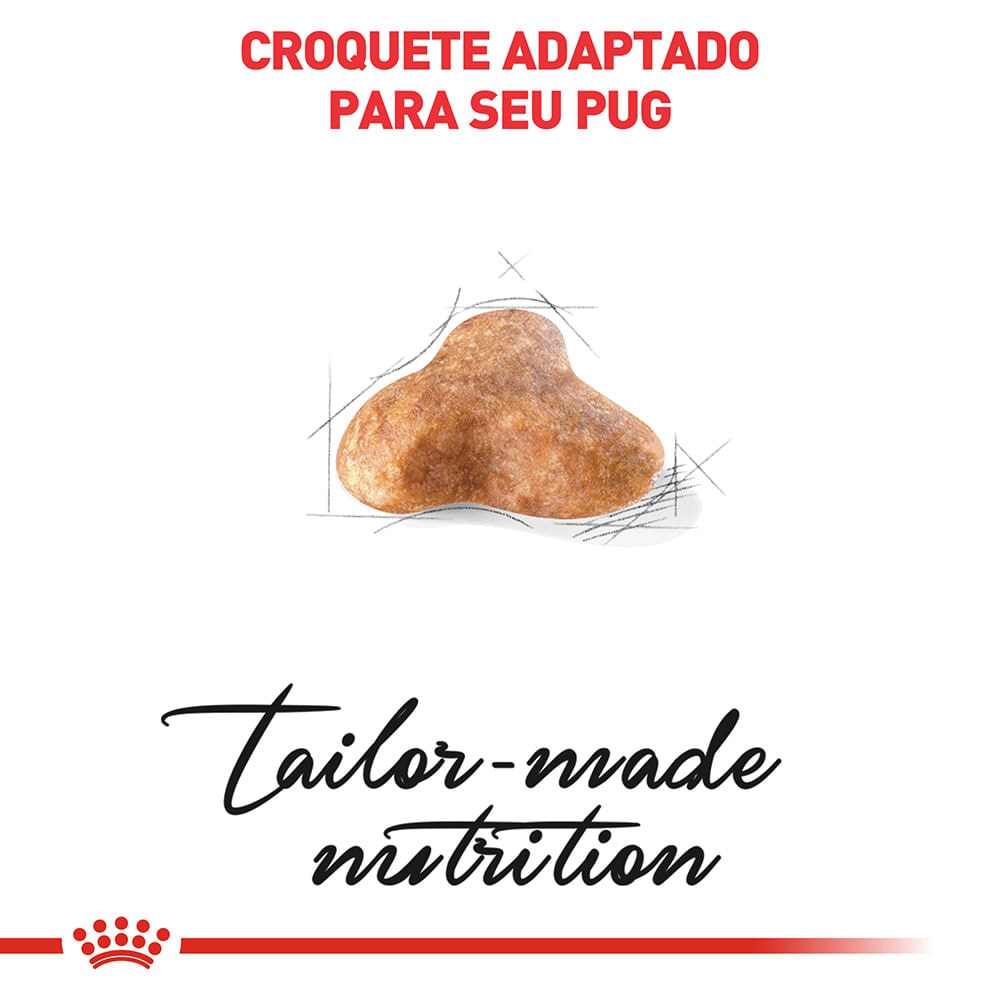 Um croquete desenvolvido exclusivamente para facilitar a preensão do alimento pelo Pug, encorajando a mastigação. A coloração dos croquetes pode variar devido aos ingredientes naturais. Especial para mandíbulas braquicefálicas: