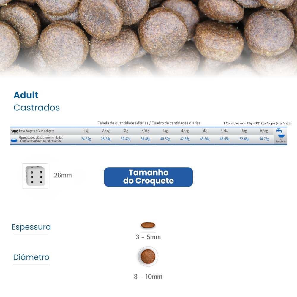 MODO DE USAR: ver TABELA DE QUANTIDADES DIÁRIAS. Nota: As quantidades são sugeridas em gramas e podem ser alteradas de acordo com as condições físicas do gato e/ou recomendação do Médico Veterinário. Deixe sempre água fresca e limpa ao alcance de seu gato e leve-o regularmente ao Médico Veterinário.