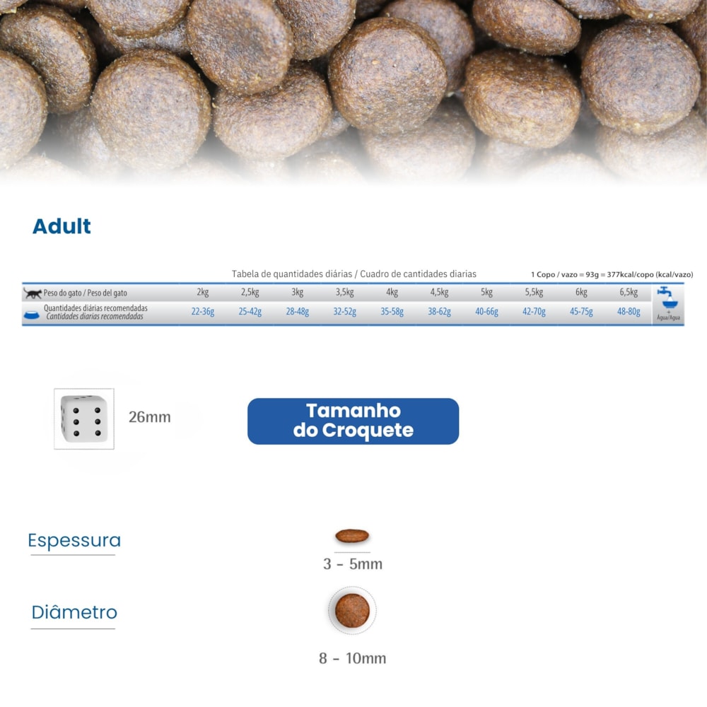 MODO DE USAR: ver TABELA DE QUANTIDADES DIÁRIAS. Nota: As quantidades são sugeridas em gramas e podem ser alteradas de acordo com as condições físicas do gato e/ou recomendação do Médico Veterinário. Deixe sempre água fresca e limpa ao alcance de seu gato e leve-o regularmente ao Médico Veterinário.