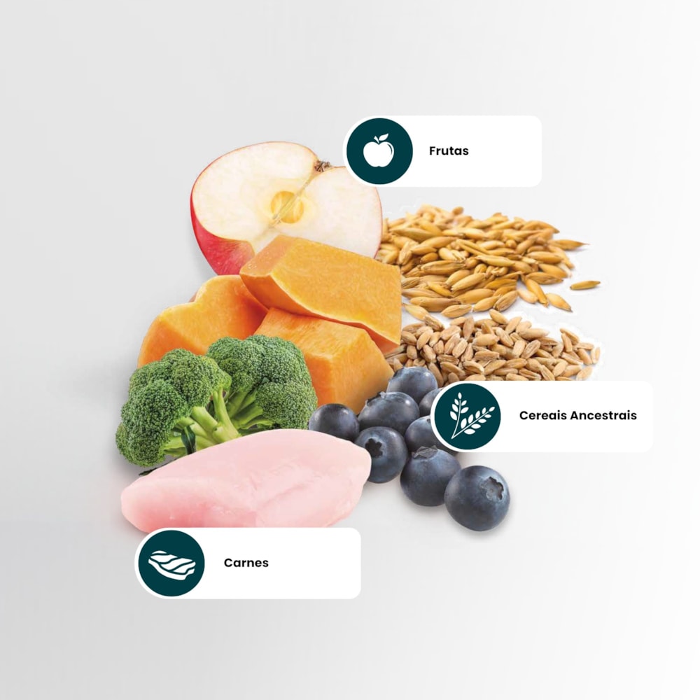 ComposiçãoCOMPOSIÇÃO BÁSICA: carne de frango (mecanicamente separada), farinha de vísceras de aves, ovo em pó, aveia, grãos de sorgo, cevada em grãos, farinha de peixe, óleo de frango, óleo de peixe, polpa de beterraba, casca de ervilha, semente de psyllium, levedura seca de cervejaria, abóbora desidratada, brócolis desidratado, cenoura desidratada, espinafre desidratado, maçã desidratada, extrato de mirtilo (blueberry), aditivos prebióticos (FOS e MOS), DL-metionina, taurina, L-carnitina, sulfato de condroitina, sulfato de glicosamina, aditivos adsorventes (extrato de yucca e zeolita), hidrolisado de fígado de aves e suínos, vitaminas (retinol (A), colecalciferol (D3), acetato de DL-alfa-tocoferol (E), tiamina (B1), riboflavina (B2), cloridrato de piridoxina (B6), cianocobalamina (B12), ácido ascórbico monofosfato (C), biotina, niacina, ácido pantotênico, ácido fólico, cloreto de colina), cloreto de potássio, ferro aminoácido quelato, cobre aminoácido quelato, zinco aminoácido quelato, manganês aminoácido quelato, proteinato de selênio, iodato de cálcio, propionato de cálcio, concentrado de tocoferóis.