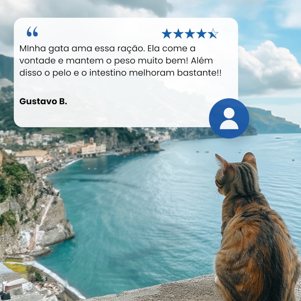ComposiçãoCOMPOSIÇÃO BÁSICA: salmão (carne mecanicamente separada de salmão, farinha de salmão – mín. 8%), farinha de peixe, farinha de vísceras de aves, farinha de torresmo, ovo em pó, amido de batata, amido de mandioca, óleo de peixe, óleo de frango, polpa de beterraba, casca de ervilha, alfafa desidratada, celulose em pó, lignocelulose, semente de psyllium, levedura seca de cervejaria, melão desidratado (mín. 0,1%), cenoura desidratada, espinafre desidratado, laranja desidratada, maçã desidratada, extrato de mirtilo (blueberry), extrato de romã, extrato de chá verde, extrato de aloe vera, cúrcuma em pó, beta caroteno, aditivos prebióticos (FOS e MOS), DL-metionina, taurina, L-carnitina, sulfato de condroitina, sulfato de glicosamina, aditivos adsorventes (extrato de yucca e zeolita), hidrolisado de fígado de aves e suínos, vitaminas (retinol (A), colecalciferol (D3), acetato de DL-alfa-tocoferol (E), tiamina (B1), riboflavina (B2), cloridrato de piridoxina (B6), cianocobalamina (B12), ácido ascórbico monofosfato (C), biotina, niacina, ácido pantotênico, ácido fólico, cloreto de colina), cloreto de potássio, cloreto de amônio, ferro aminoácido quelato, cobre aminoácido quelato, zinco aminoácido quelato, manganês aminoácido quelato, proteinato de selênio, iodato de cálcio, propionato de cálcio, concentrado de tocoferóis.