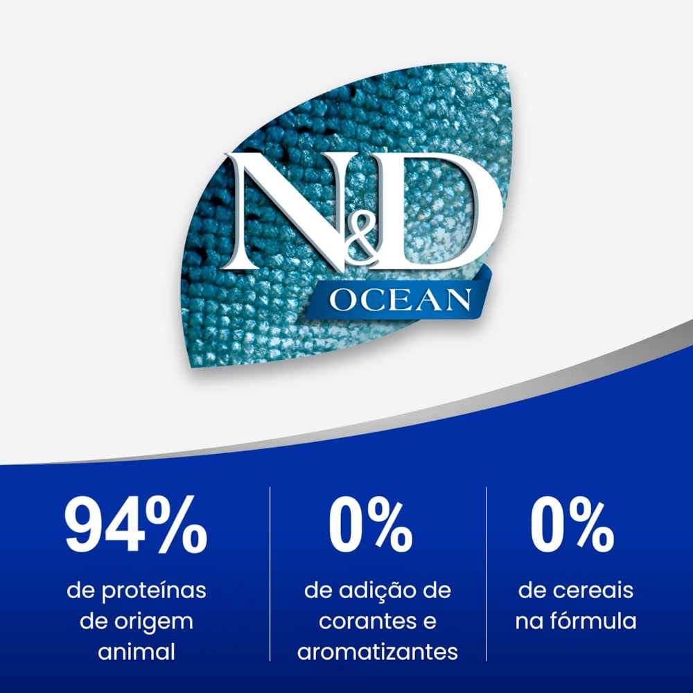 Ofereça ao seu pet os benefícios dos frutos do mar com N&D Ocean. Com 94% de proteínas de origem marinha, é naturalmente rico em ácidos graxos ômega-3 para promover vitalidade.