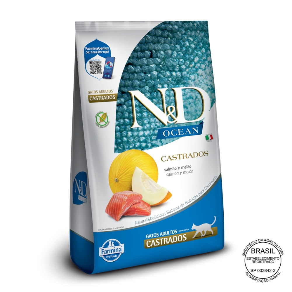 Ração Seca Farmina N&D Ocean para Gatos Adultos Castrados de Todas as Raças Sabor Salmão e Melão 7,5Kg