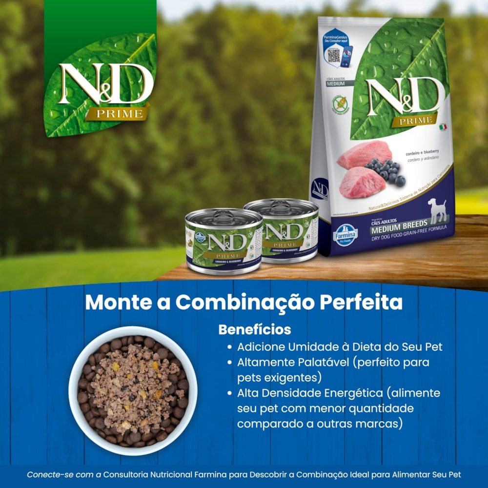 A Farmina utiliza fornecedores confiáveis para garantir ingredientes de alta biodisponibilidade em seus produtos. A linha N&D Prime usa carnes como cordeiro e frango, além de ingredientes funcionais com benefícios antioxidantes e digestivos. Composta por 98% de proteínas de origem animal de alto valor biológico, N&D Prime oferece uma nutrição completa e balanceada.