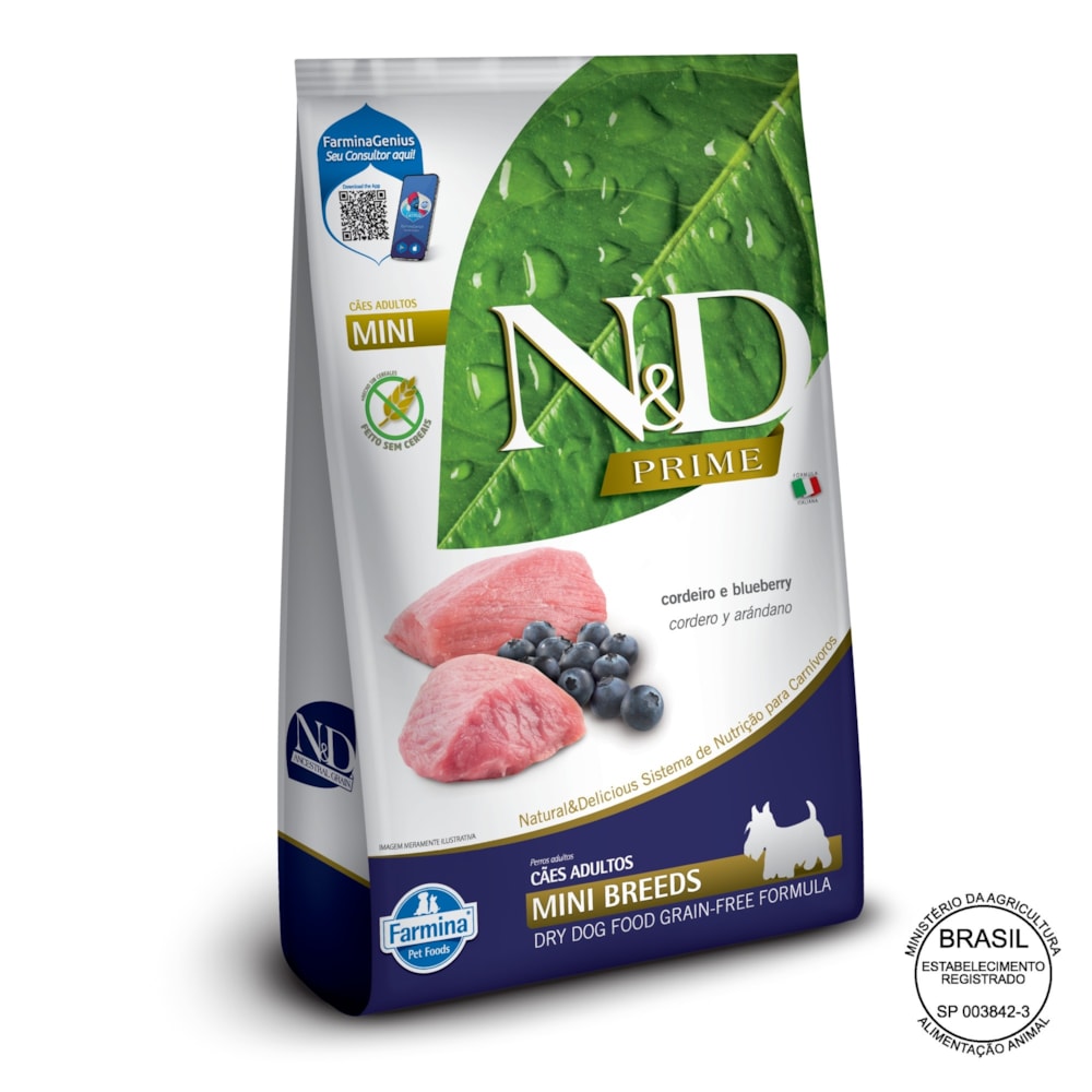 Ração Seca Farmina N&D Prime para Cães Adultos de Raças Mini e Pequenas Sabor Cordeiro e Blueberry 10,1Kg