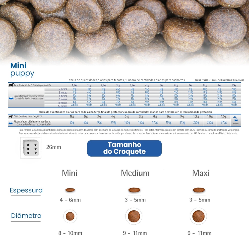 Para fêmeas lactantes as quantidades diárias de alimento variam de acordo com a semana de lactação e o número de filhotes. Para obter informações entre em contato com o SAC Farmina ou consulte um Médico Veterinário.