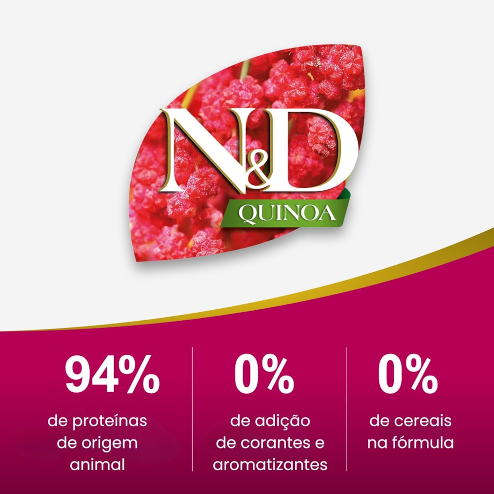 - Desenvolvida por nutricionistas e veterinários, N&D Quinoa integra ciência e natureza para entregar uma alimentação funcional e completa.