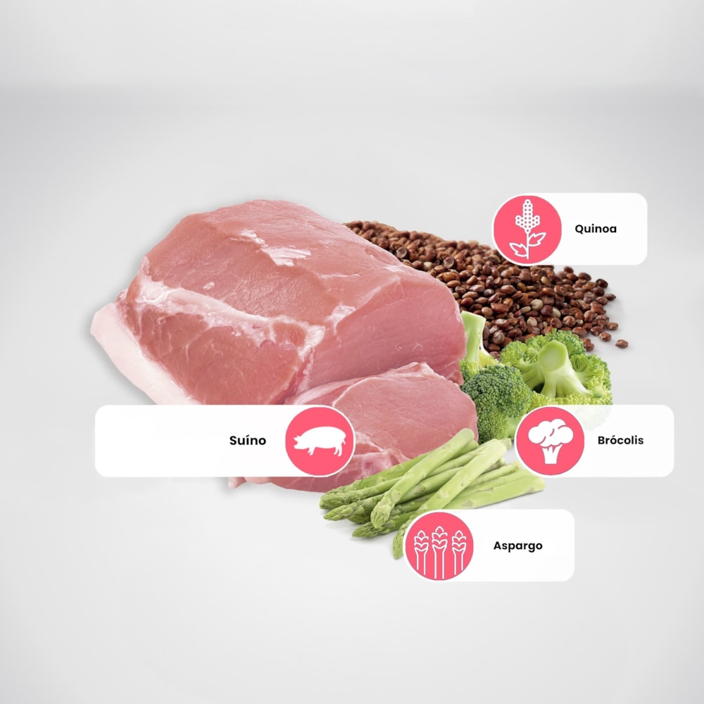 COMPOSIÇÃO BÁSICA: Suíno (carne de suíno, farinha de torresmo - mín. 3%), farinha de vísceras de aves, ovo em pó, proteína hidrolisada de frango, grão de quinoa (mín. 5%), amido de batata, amido de mandioca, gordura suína, óleo de frango, óleo de peixe, polpa de beterraba, semente de psyllium, semente de linhaça, casca de ervilha, alfafa desidratada, brócolis desidratados (mín. 0,15%), aspargo desidratado (mín. 0,15%), lignocelulose, extrato de aloe vera, beta caroteno, aditivos prebióticos (FOS e MOS), DL-metionina, taurina, L-carnitina, sulfato de condroitina, sulfato de glicosamina, aditivo adsorvente (zeolita), hidrolisado de fígado de aves e suínos, vitaminas (A, D3, E, B1, B2, B5, B6, B12, C, biotina, niacina, ácido fólico, cloreto de colina), cloreto de potássio, carbonato de cálcio, fosfato bicálcico, ferro aminoácido quelato, cobre aminoácido quelato, zinco aminoácido quelato, manganês aminoácido quelato, proteinato de selênio, iodato de cálcio, propionato de cálcio, concentrado de tocoferóis.