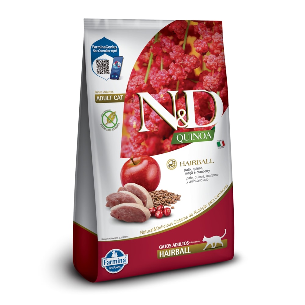 Ração Seca Farmina N&D Quinoa Hairball para Gatos Adultos de Todas as Raças Sabor Pato, Quinoa, Maçã e Cranberry 1,5Kg
