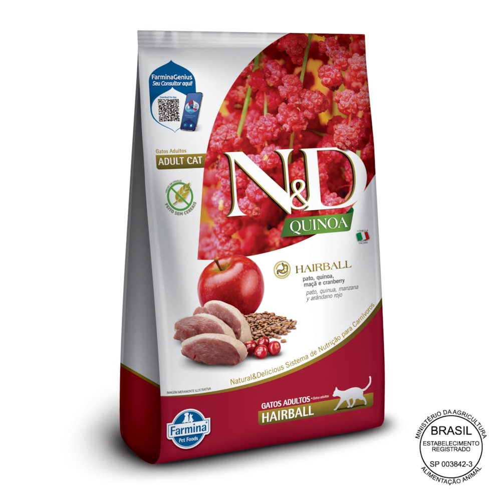 Desenvolvida especialmente para gatos adultos, a linha N&D Quinoa é composta por ingredientes livres de transgênicos, como Pato, Quinoa, Maçã e Cranberry. Esta fórmula contém fibras e ingredientes funcionais que ajudam a controlar e reduzir a formação de bolas de pelo, melhorando a motilidade intestinal e facilitando a passagem dos pelos pelo sistema digestivo. Experimente a diferença na saúde do seu pet com N&D Quinoa — 100% de Garantia de Satisfação.