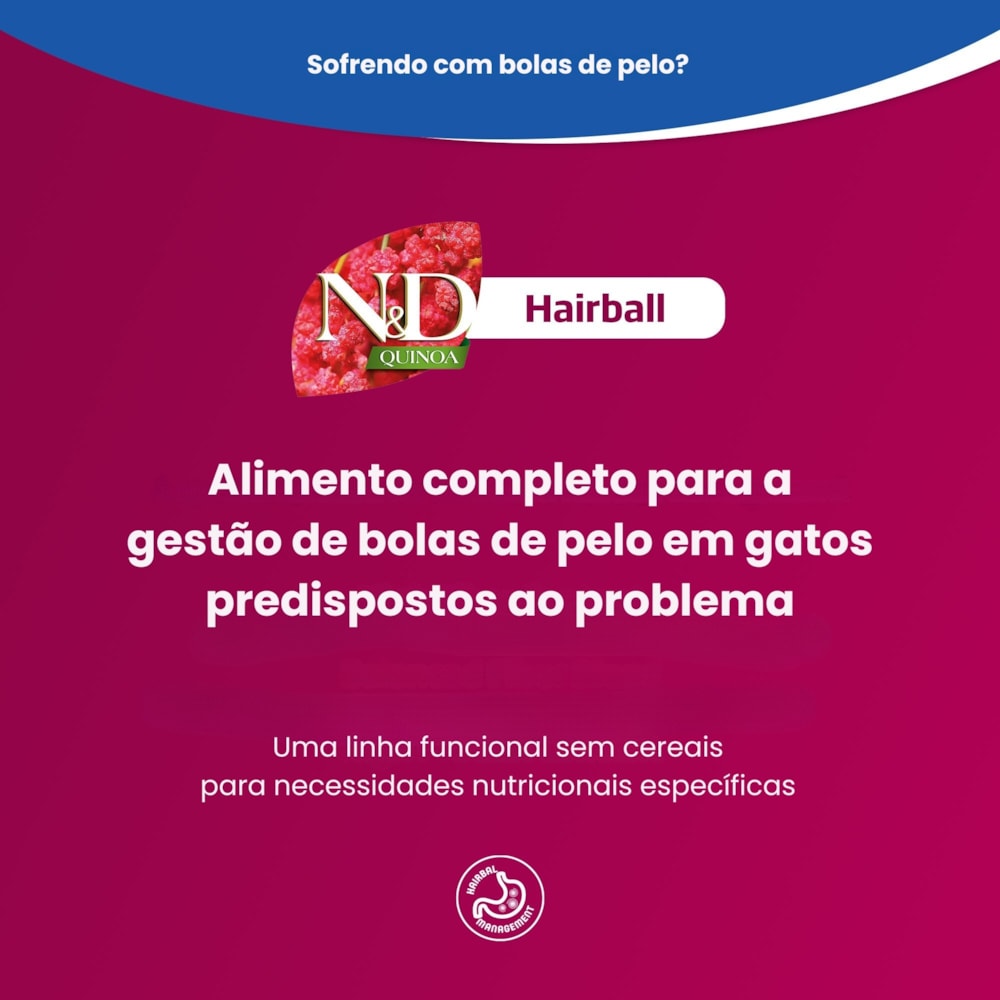 Tipo de produto: Alimento completo e balanceado para gatos adultos, indicado para facilitar a eliminação de bolas de pelo.