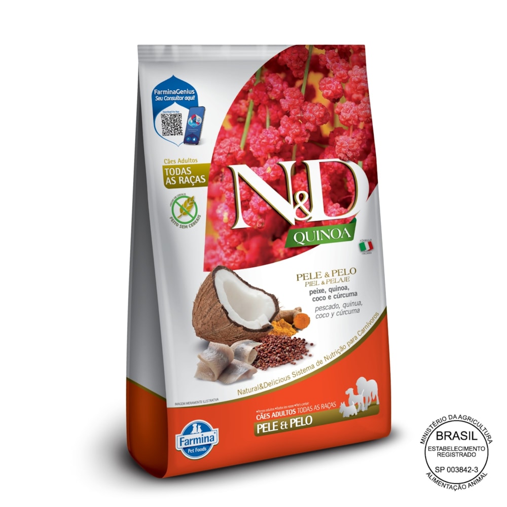 Conheça os benefícios funcionais da linha N&D Quinoa e ofereça ao seu pet a nutrição que ele merece com Ração Seca Farmina N&D Quinoa Pele e Pelo para Cães Adultos de Todas as Raças Sabor Peixe, Quinoa, Coco e Cúrcuma 10,1Kg. Esta receita para cães é ideal para pets adultos de todos os portes, com ingredientes livres de transgênicos como Peixe, Quinoa, Coco e Cúrcuma. Indicada para pets com sensibilidades alimentares, essa fórmula combina quinoa, coco e cúrcuma para promover uma pele saudável e um pelo brilhante, enquanto reduz inflamações e mantém a saúde cutânea. Experimente a diferença na saúde do seu pet com N&D Quinoa — 100% de Garantia de Satisfação.