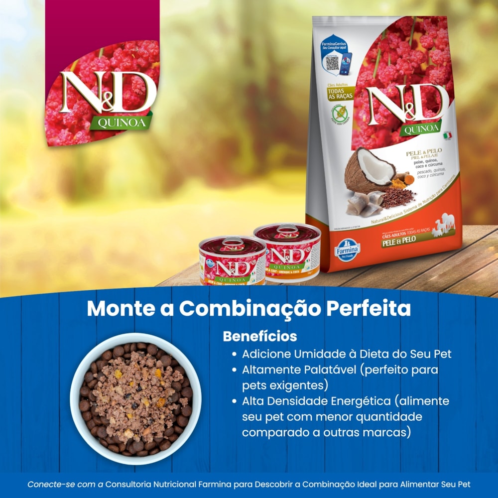 Desenvolvida por nutricionistas e veterinários, N&D Quinoa integra ciência e natureza para entregar uma alimentação funcional e completa. A linha é ideal para quem busca um alimento que não apenas nutre, mas também contribui para a saúde e longevidade do pet.