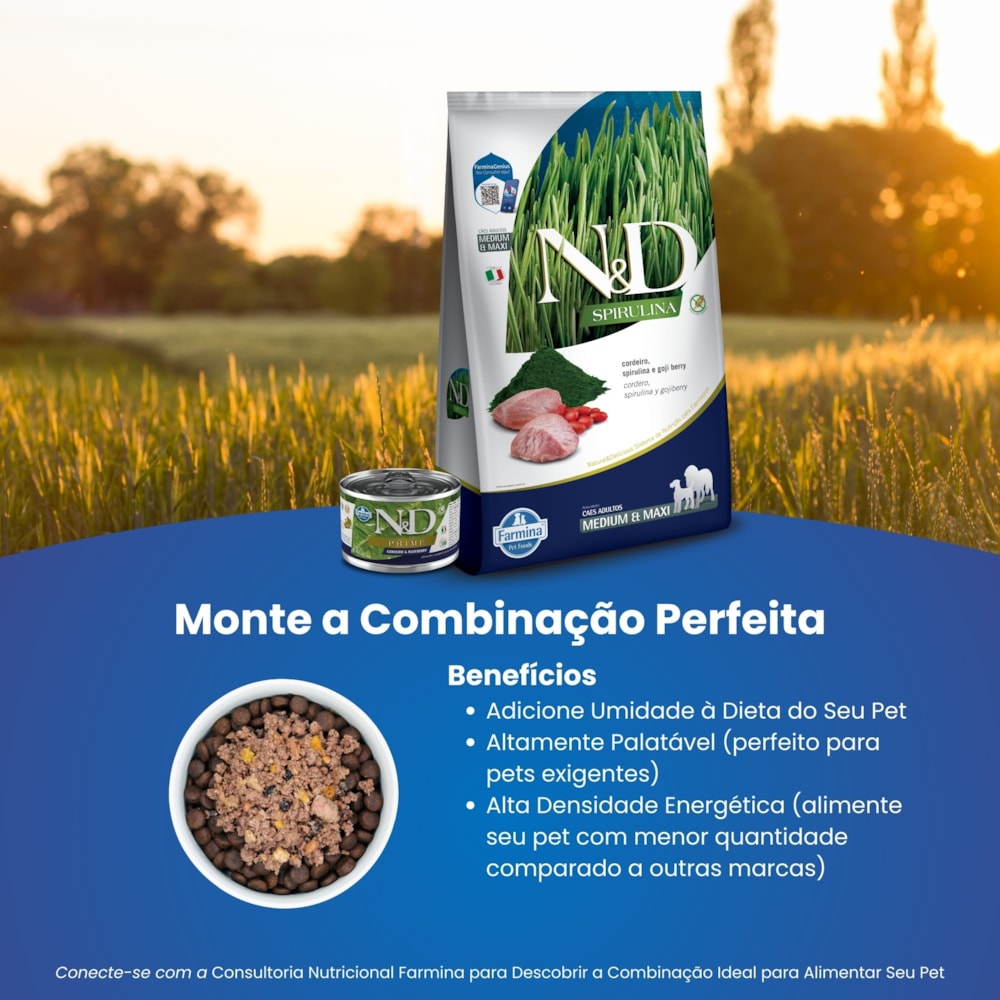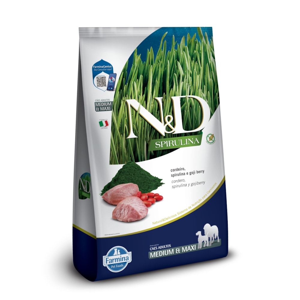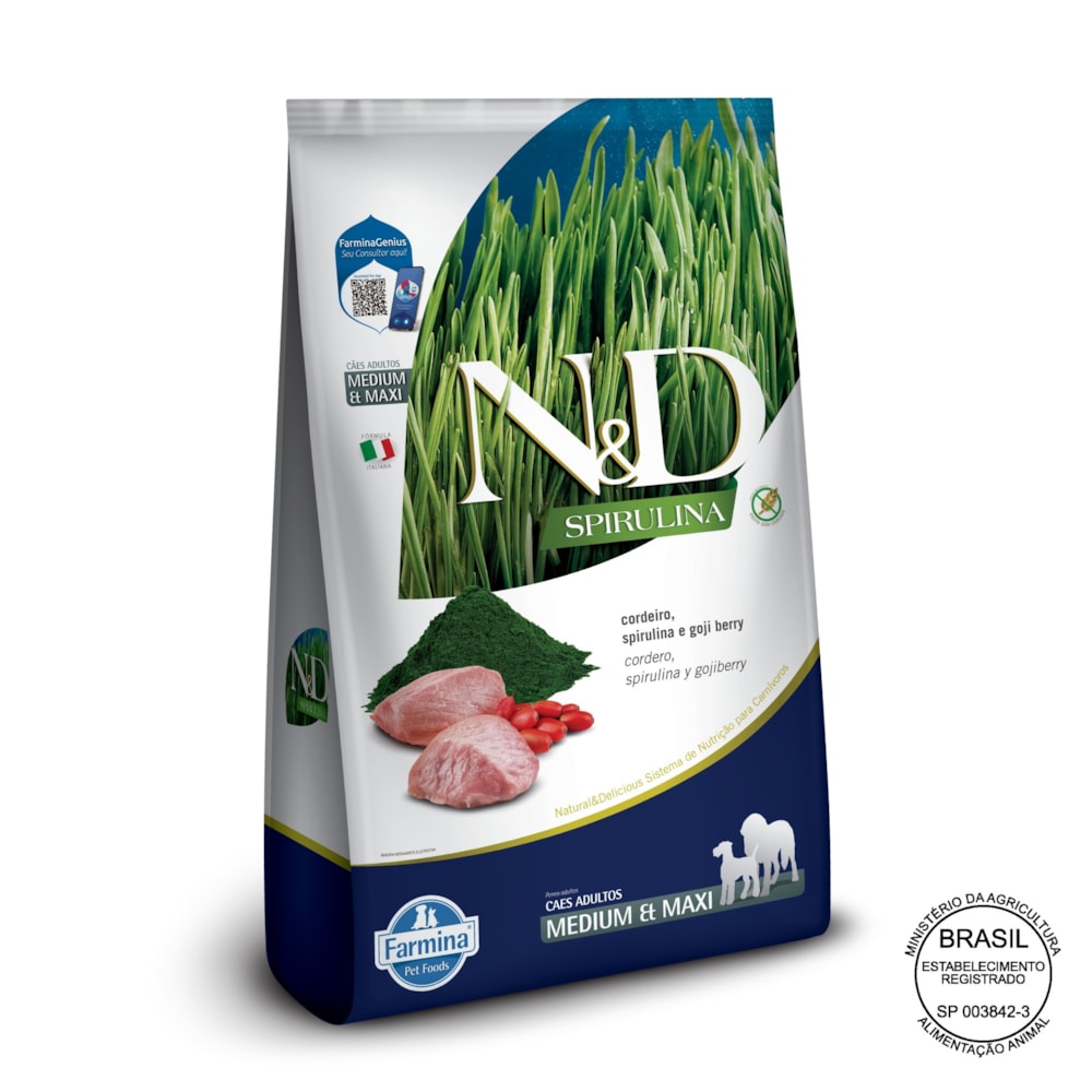 Ofereça ao seu pet a nutrição que ele merece com a Ração Seca Farmina N&D Spirulina. Esta receita é ideal para cães adultos de porte médio e grande, combinando ingredientes de alta qualidade, como Cordeiro, Spirulina e Goji Berry, todos livres de transgênicos.