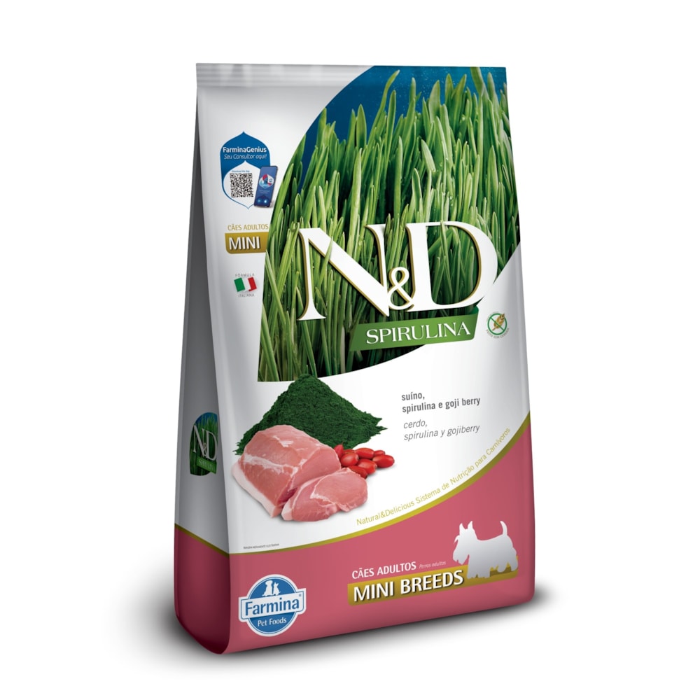 Ração Seca Farmina N&D Spirulina para Cães Adultos de Raças Mini e Pequenas Sabor Suíno, Spirulina e Goji Berry 7Kg