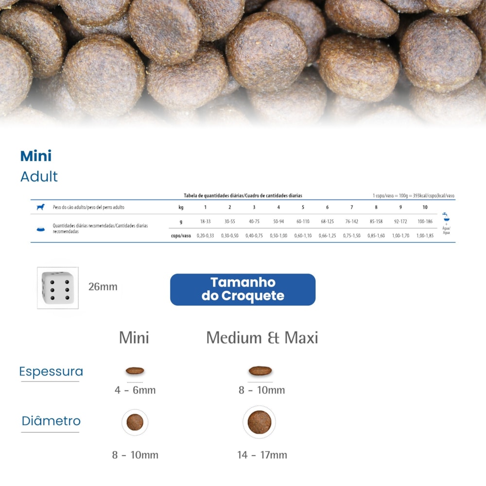 Modo de UsarImportante: Consulte a TABELA DE QUANTIDADES DIÁRIAS para determinar a quantidade ideal para o seu cão. As quantidades são sugeridas em gramas e podem ser ajustadas conforme as condições físicas do seu pet e/ou recomendação do Médico Veterinário. Não se esqueça de deixar sempre água fresca e limpa ao alcance do seu cão e levá-lo regularmente ao Médico Veterinário.