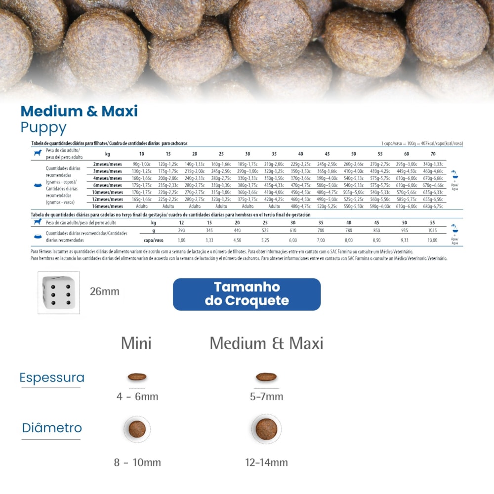 Observação: Para fêmeas lactantes, as quantidades diárias de alimento variam de acordo com a semana de lactação e o número de filhotes. Para obter informações detalhadas, entre em contato com o SAC Farmina ou consulte um Médico Veterinário.