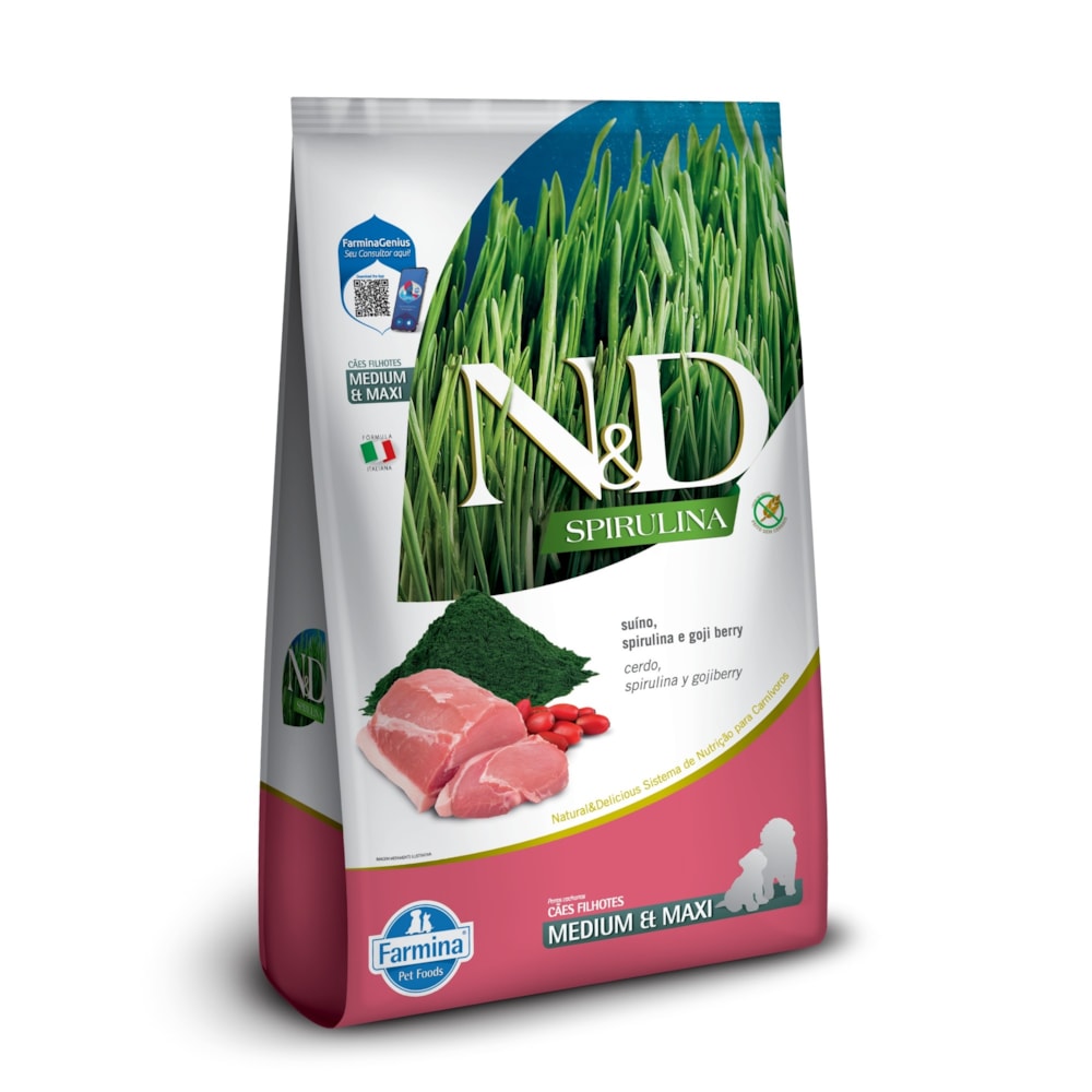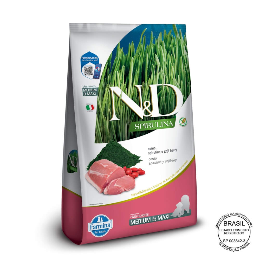 Ofereça ao seu pet a nutrição que ele merece com a Ração Seca Farmina N&D Spirulina. Esta receita é ideal para cães filhotes de porte médio e grande, utilizando ingredientes livres de transgênicos, como Suíno, Spirulina e Goji Berry. Experimente a diferença com N&D Spirulina — 100% de Garantia de Satisfação.