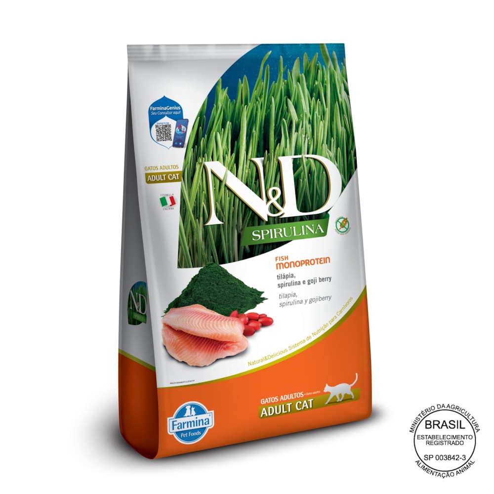 Ofereça ao seu gato a nutrição que ele merece com a Ração Seca Farmina N&D Spirulina. Esta fórmula é ideal para gatos adultos de todas as raças e portes, combinando ingredientes de alta qualidade, como Tilápia, Spirulina e Goji Berry, todos livres de transgênicos.