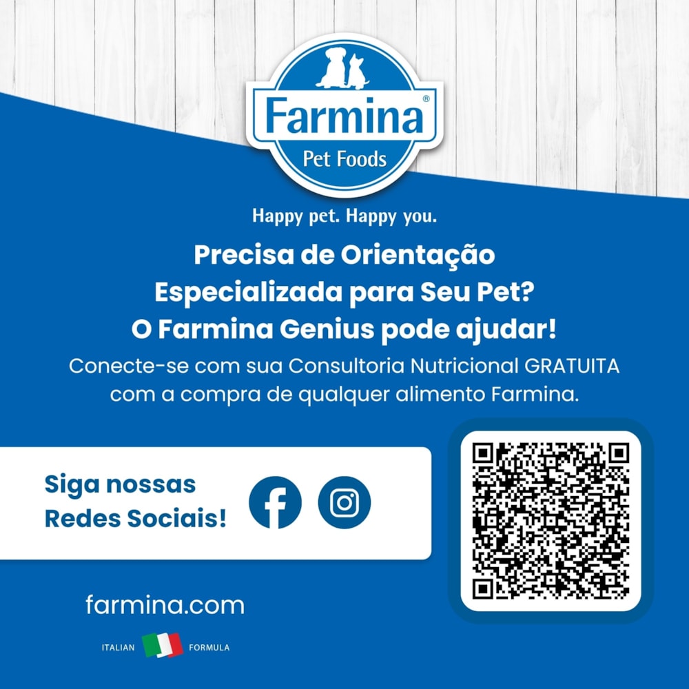 Na Farmina, somos uma empresa familiar italiana que, desde 1965, se dedica a cuidar da saúde dos pets através de uma nutrição de altíssima qualidade. Com o apoio de pesquisas científicas de universidades de renome mundial, desenvolvemos soluções nutricionais ultra-premium que atendem a todas as necessidades dos pets, inclusive aqueles com dietas especiais, garantindo um cuidado completo.