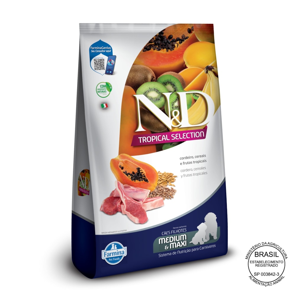 Informações N&D Tropical para Cães Filhotes de Raças Médias e Grandes - Sabor Cordeiro, Cereais e Frutas Tropicais 10,1Kg