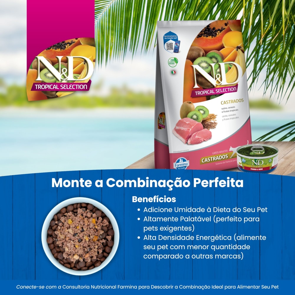 Apresentamos a Ração Seca Farmina N&D Tropical, especialmente formulada para gatos adultos castrados de todas as raças. Com um sabor irresistível de suíno, cereais e frutas tropicais, essa ração oferece a nutrição que seu pet merece.