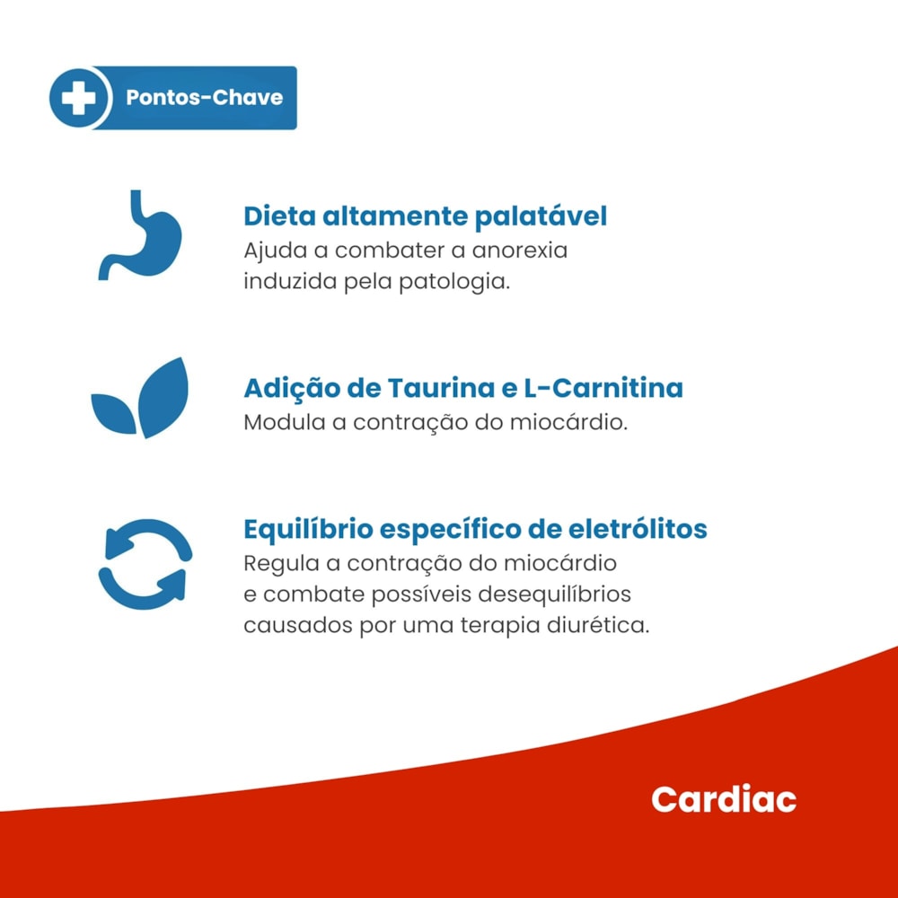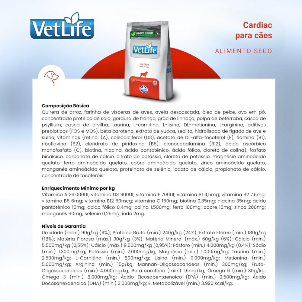 A fórmula Vet Life Cardiac foi desenvolvida para promover a saúde cardíaca, auxiliando no manejo de doenças cardíacas com uma dieta balanceada em sódio e enriquecida com taurina e L-carnitina, que ajudam a melhorar a função cardiovascular. Ingredientes de alta digestibilidade fornecem a energia necessária sem sobrecarregar o sistema circulatório.