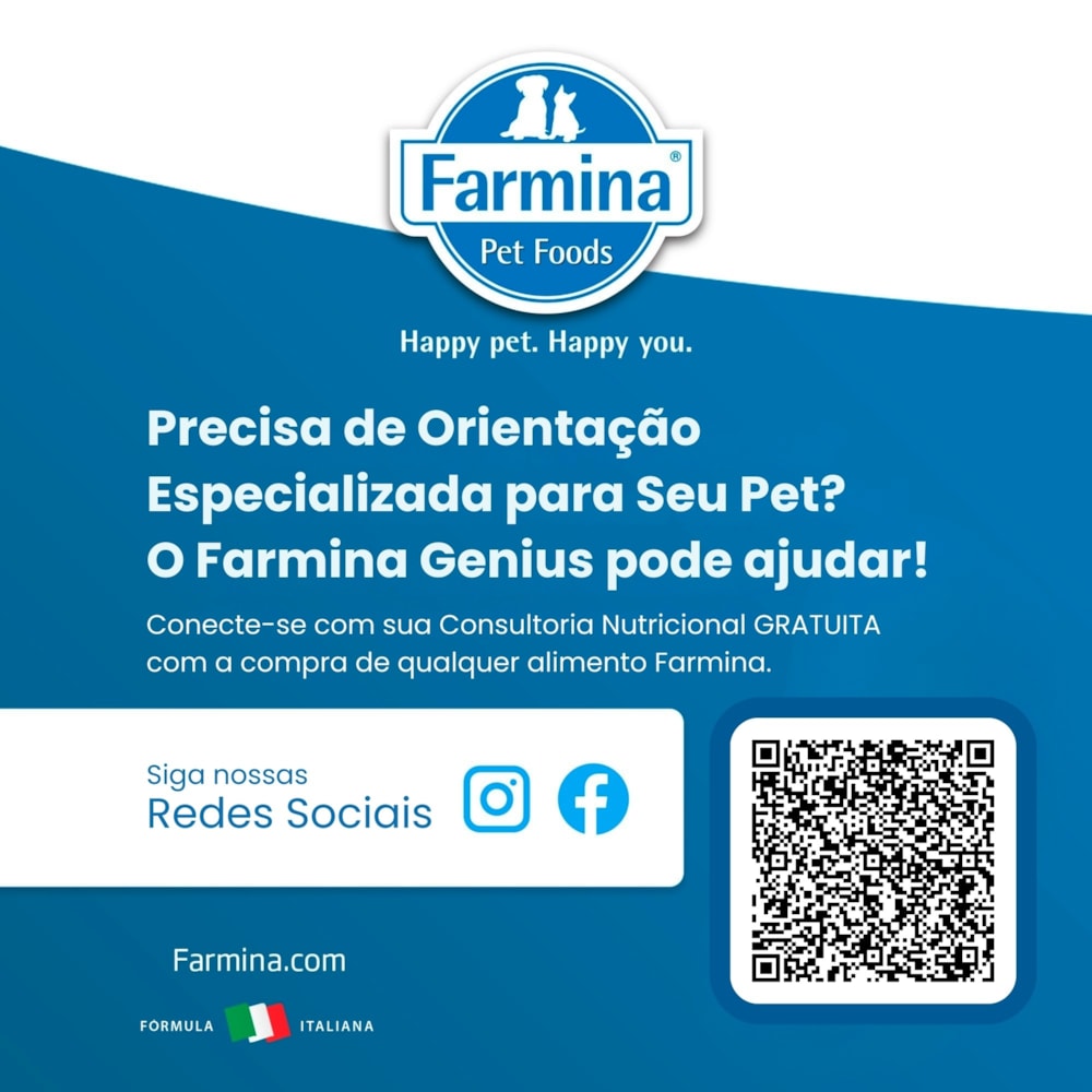 Suporte Nutricional Personalizado: Acesse um plano nutricional gratuito e receba apoio especializado com a Consultoria Nutricional Farmina, online ou através do aplicativo Farmina Genius.