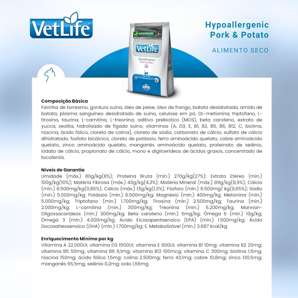 Garanta ao seu gato a nutrição que ele precisa com a linha Vet Life Hypoallergenic Pork & Potato, formulada para reduzir reações alérgicas e intolerâncias alimentares.
