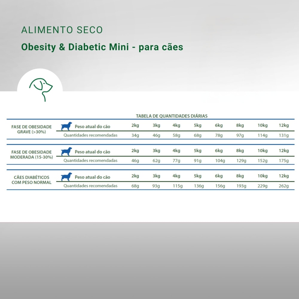 Modo de UsarMODO DE USAR: Obesidade: O início do manejo dietético é recomendado quando o peso do cão é superior a 15% em relação ao padrão da raça. Utilizar Vet Life Natural Canine Obesity & Diabetic Mini Breeds até atingir o peso ideal. Nos casos de obesidade grave (>30% do peso padrão) aconselha-se proceder em duas fases de restrição calórica: utilizar a tabela para fase de obesidade grave até que o animal apresente sobrepeso igual ou menor que 30%. Em seguida, passar para a tabela de fase de obesidade moderada (15 a 30% acima do peso padrão). Recomenda-se que a perda de peso semanal seja de 1 a 2% do peso total. Recomenda-se o monitoramento semanal do peso do cão. A prática de exercício físico é aconselhável, mas deve ser estabelecida de acordo com o protocolo do Médico Veterinário.