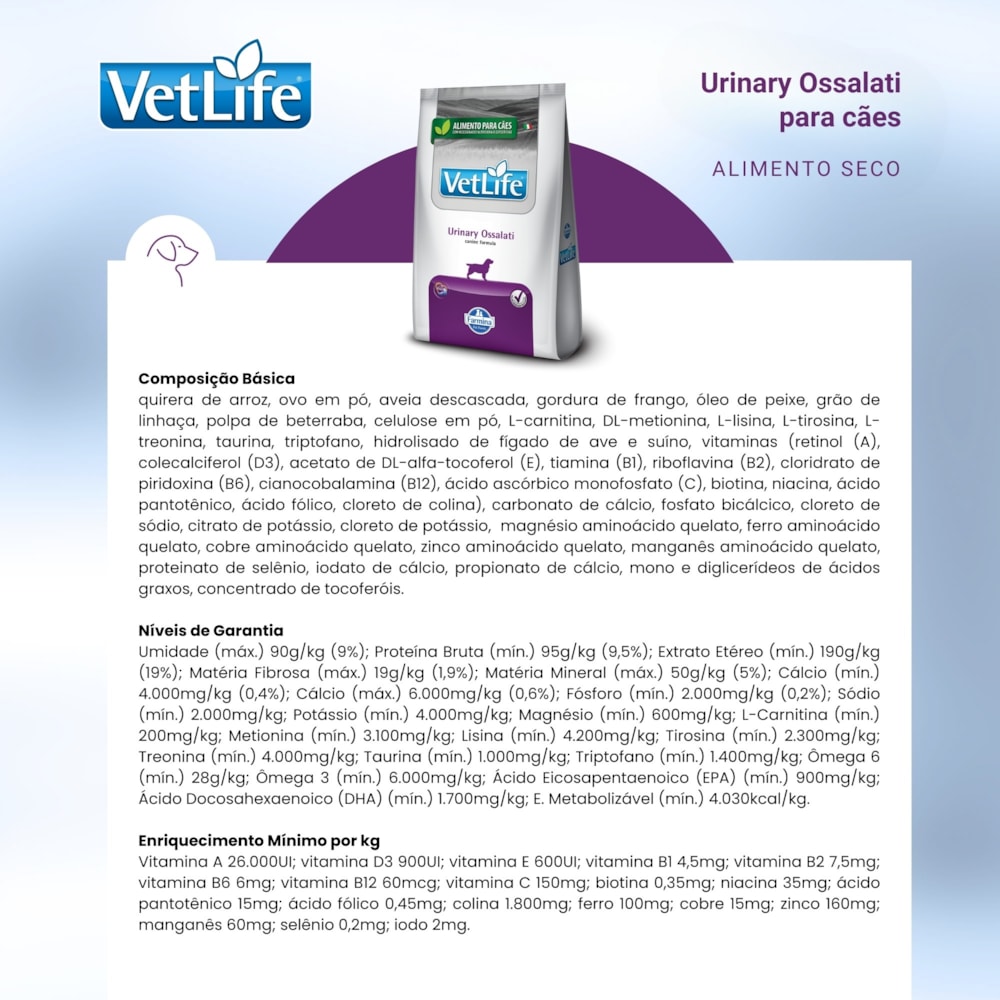 Modo de UsarMODO DE USAR: Período de utilização recomendado: para a redução da formação de cálculo à base de uratos até 6 meses. Para distúrbios irreversíveis do metabolismo do ácido úrico, utilizar por toda vida. Para a redução da formação de cálculos à base de oxalato até 6 meses; para redução de cálculos a base de cistina inicialmente até 1 ano. Na maioria dos casos Vet Life Natural Canine Urinary Ossalati não requer adições ou complementações. As quantidades diárias podem sofrer variações de acordo com a raça do cão, atividade física e gravidade do distúrbio fisiológico e/ou metabólico e podem sofrer ajustes a critério do Médico Veterinário. A quantidade diária pode ser dividida em duas ou mais refeições. Recomenda-se deixar sempre água fresca e limpa à vontade a fim de hidratar o máximo possível o animal.