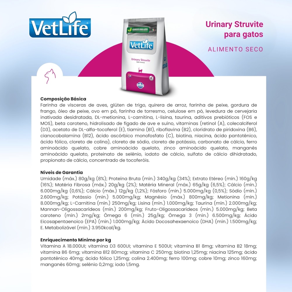 Ofereça ao seu gato a nutrição que ele precisa com a linha Vet Life Urinary Struvite, formulada para auxiliar no manejo de distúrbios urinários provocados pela formação de cálculos à base de estruvita.