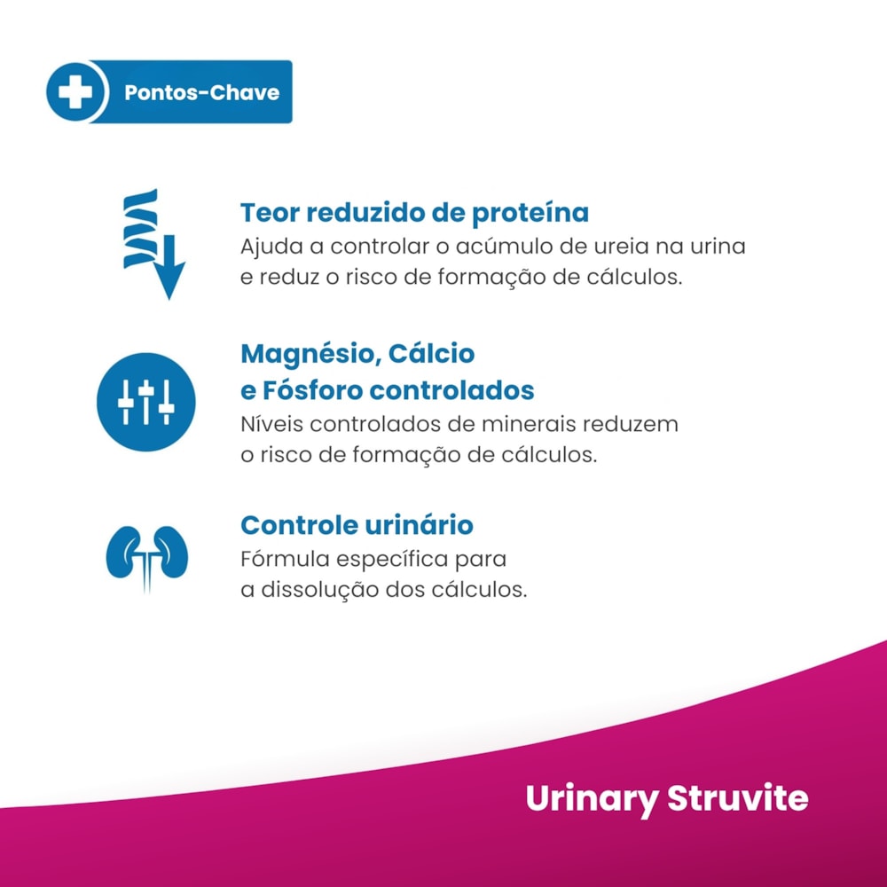 Tipo de produto: Alimento coadjuvante seco indicado para gatos com distúrbios urinários provocados pela formação de cálculos à base de estruvita.