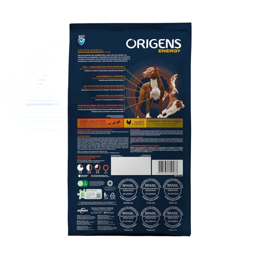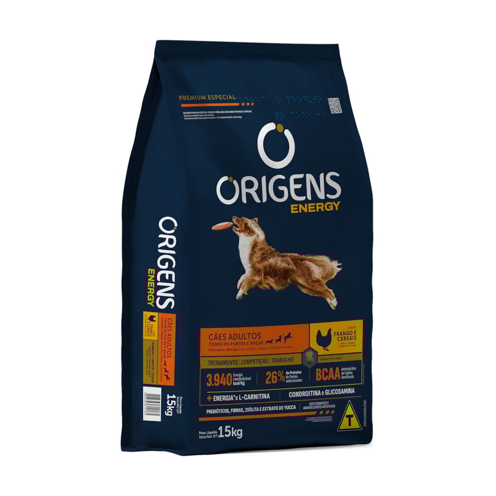 A Ração Seca Origens Energy Premium Especial Frango e Cereais para Cães Adultos é a escolha ideal para os peludos adultos que demandam uma dieta de alto desempenho. Desenvolvida para atender às necessidades específicas de cães de trabalho, em treinamento ou competição, esta ração é formulada com ingredientes de alta qualidade, proporcionando uma fonte equilibrada de proteínas e energia. Com a presença de aminoácidos, essenciais para a recuperação e síntese muscular, favorece a performance elevada, garantindo que seu pet receba os nutrientes necessários para suportar suas atividades intensas. Informações Nutricionais