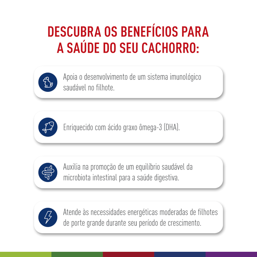 Formulada com proteínas de alta digestibilidade, prebióticos, vitaminas e minerais essenciais, ela contribui para uma digestão eficiente, fortalece as defesas naturais do organismo e fornece energia sob medida para o porte do animal. Além disso, é enriquecida com DHA, essencial para o desenvolvimento cerebral e aprendizado desde os primeiros treinos.