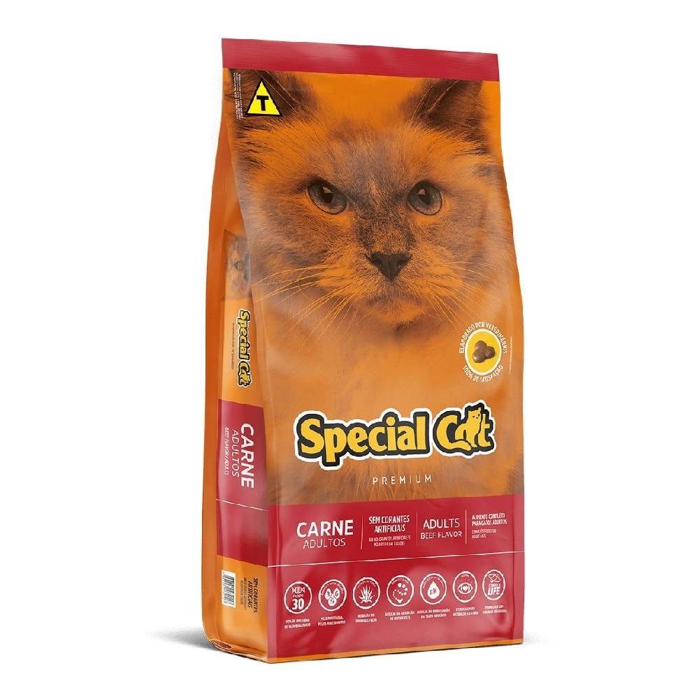 A Ração Special Cat Premium Para Gatos Adultos Sabor Carne é um alimento completo desenvolvido com todas as vitaminas, nutrientes e substâncias que o seu gato precisa para viver de forma mais saudável e com uma pelagem sempre bonita! Com 30% de proteína de alta qualidade, Ômegas 3 e 6 e Zinco Orgânico que ajudam a manter a pele protegida e reduz a queda de pelos. A fórmula da Ração Special Cat Premium Para Gatos Adultos Sabor Carne, contém Extrato de Yucca que reduz o odor das fezes em até 50% e Prebiótico Mos + Fibras Especiais que ajudam nas funções intestinais. Sua composição também é enriquecida de DHA que estimula a capacidade de aprendizagem e a Taurina que é essencial para o coração e a visão. Além de conter COMPLEX LIFE que são minerais orgânicos que facilitam a absorção e equilibram a demanda nutricional do seu gato, proporcionando mais vigor para as atividades do dia a dia.