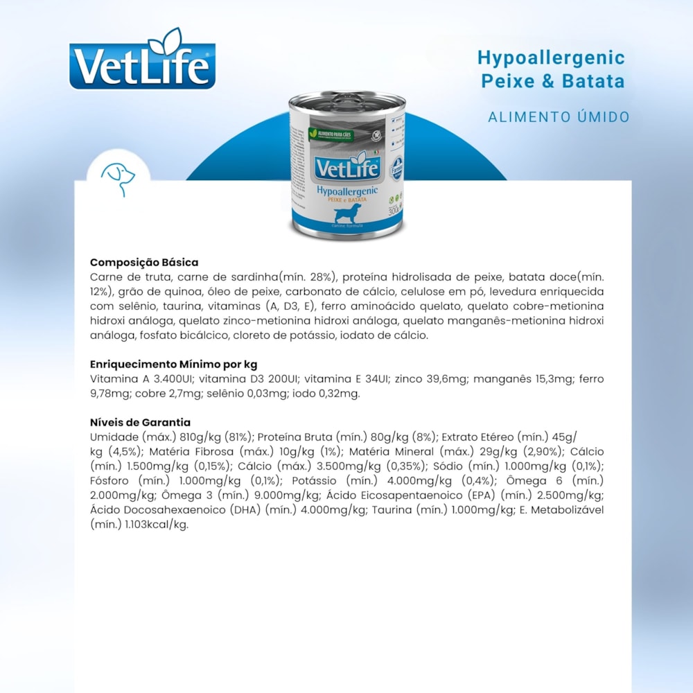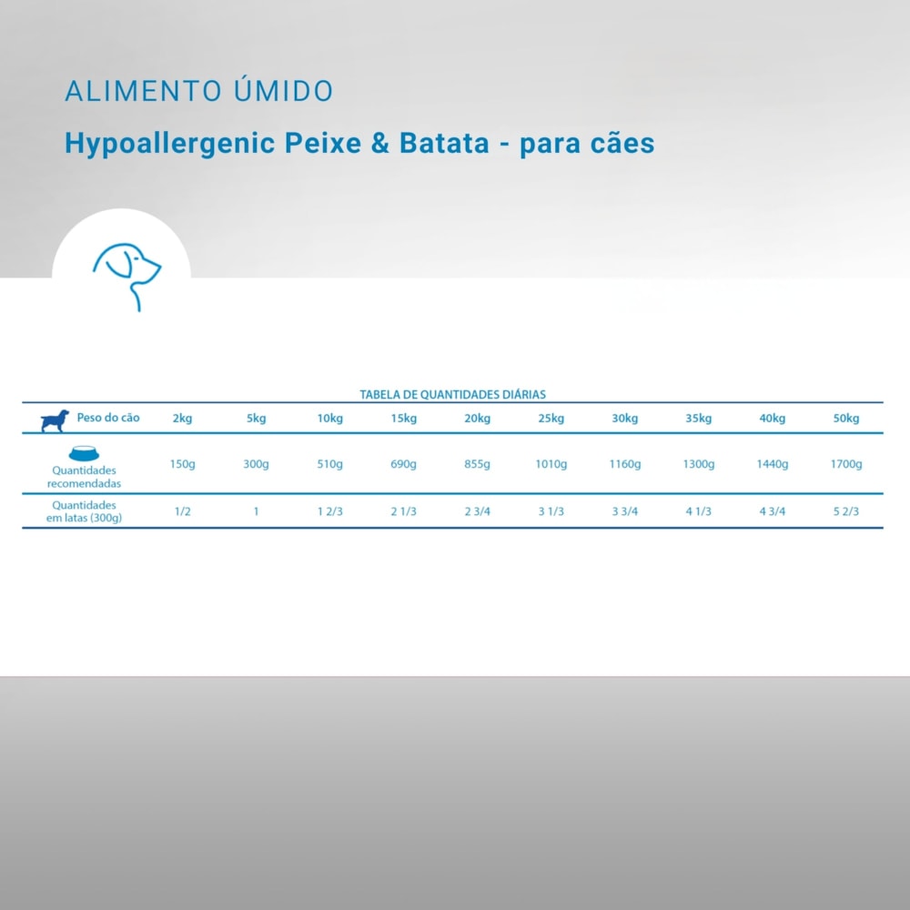 Tipo de produto: Alimento coadjuvante úmido formulado para reduzir os sintomas dermatológicos e gastrointestinais das reações adversas aos alimentos.