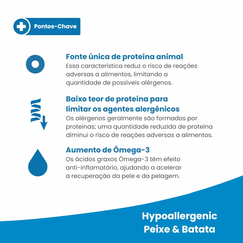 A fórmula Vet Life Hypoallergenic foi desenvolvida para promover a redução de reações adversas a alimentos, ajudando no manejo de alergias alimentares com ingredientes de alta qualidade e equilíbrio nutricional. Sem transgênicos, com ingredientes de altíssima palatabilidade e digestibilidade como o Peixe, essa fórmula monoproteica oferece suporte à função dermal saudável, auxiliando na manutenção da pele e do sistema digestivo.