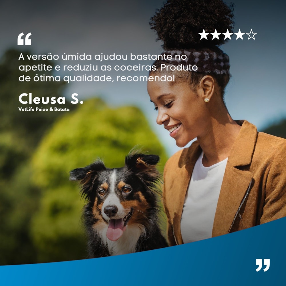 livre de ingredientes geneticamente modificados e utilizando embalagens BPA Free, Vet Life Wet garante a segurança alimentar e a preservação da qualidade dos ingredientes. A textura úmida das receitas facilita a ingestão, especialmente para pets debilitados, ao mesmo tempo em que aumenta a hidratação, essencial para a saúde geral. Desenvolvidas por nutricionistas e veterinários, essas fórmulas são recomendadas como parte de uma alimentação controlada e assistida por profissionais.