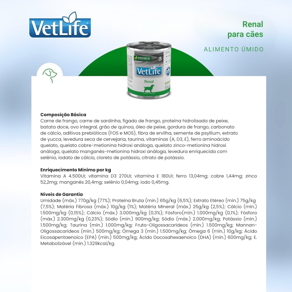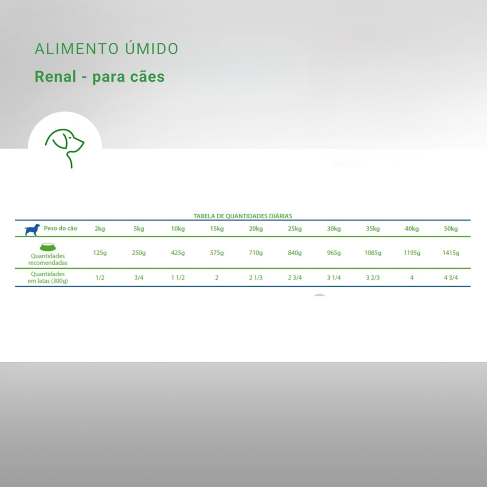 Tipo de produto: Alimento coadjuvante úmido indicado para cães com doença renal crônica ou aguda
